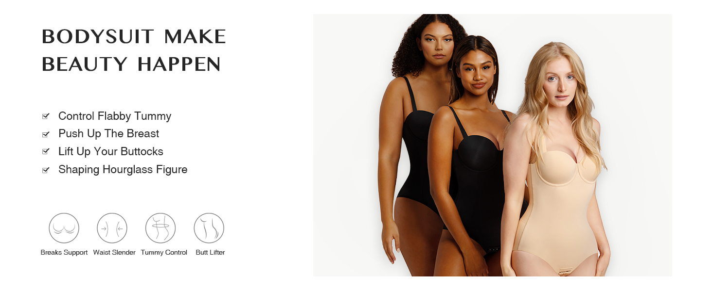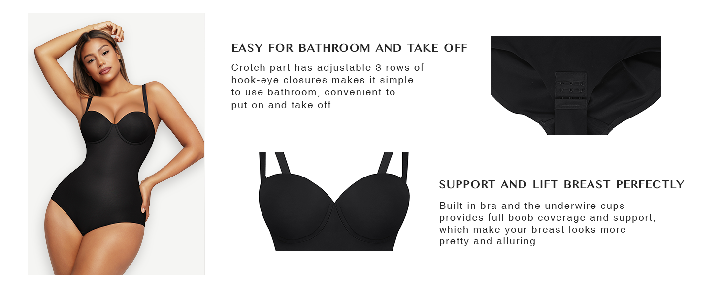- u003Cliu003Eu003Cspan class=u0022a-list-item a-size-base a-color-baseu0022u003E【BUILT-IN BRA BODYSUIT WITH REMOVABLE u0026 ADJUSTABLE STRAPS】Our shapewear bodysuit features a built-in bra with underwire cups that provide full coverage and support, enhancing the appearance of your breasts. The removable and adjustable straps offer versatility, allowing you to wear the bodysuit as a strapless option and adjust the fit as needed.u003C/spanu003Eu003C/liu003E u003Cliu003Eu003Cspan class=u0022a-list-item a-size-base a-color-baseu0022u003E【SMOOTH u0026 COMFORTABLE SHAPEWEAR BODYSUIT】This slimming bodysuit for women is made from 52% Nylon and 48% Spandex on the outside, and 62% Nylon and 38% Spandex for the lining. The fabric is very comfortable and stretchy, offering a soft, breathable feel suitable for wearing in all seasons. Making your body appear smoother and slimmer.u003C/spanu003Eu003C/liu003E u003Cliu003Eu003Cspan class=u0022a-list-item a-size-base a-color-baseu0022u003E【TUMMY CONTROL BODY SHAPER FOR WOMEN】Our shapewear bodysuit features double layers on the tummy and waist, offering effective tummy control to hold the midsection firmly in place. It smooths out bumps and bulges, improves back posture, and provides a smooth look with a comfortable feel. Youu0027ll love how this bodysuit shapewear cinches the waist, providing the right amount of control and giving you the flawless curve.u003C/spanu003Eu003C/liu003E u003Cliu003Eu003Cspan class=u0022a-list-item a-size-base a-color-baseu0022u003E【BUTT LIFTER u0026 HOOK DESIGN】This bodysuit for womenu0027s crotch part has adjustable 3 rows of hook-eye closures, making it simple to use the bathroom and convenient to put on and take off. The shapewear bodysuit with hip cover and pleats sewing design can lift and tighten your butt. The edge of the butt part features folded and fitted technology, ensuring comfort without any traces or tightness.u003C/spanu003Eu003C/liu003E u003Cliu003Eu003Cspan class=u0022a-list-item a-size-base a-color-baseu0022u003E【VERSATILE FOR ANY OCCASION u0026 OUTFIT】The shapewear bodysuit is versatile and suitable for any occasion, including weddings, parties, the office, home, holidays, and cocktail events. It can be paired with jeans, shorts, dresses, skirts, or cardigan jackets to create a slimming and charming look.u003C/spanu003Eu003C/liu003E